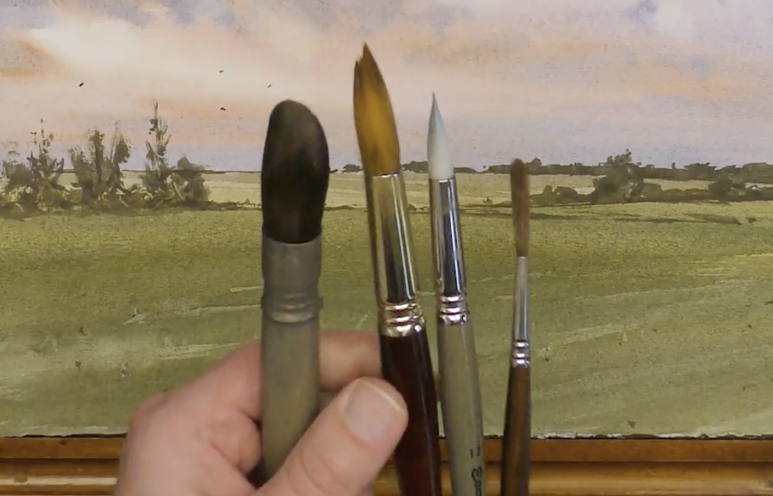 It happens all too often that students use only one or two brushes for their whole scene. Typically, I use these four brushes for a watercolor painting: a large mop brush, a medium round brush, a small brush with a point and a rigger brush (these are affiliate links).